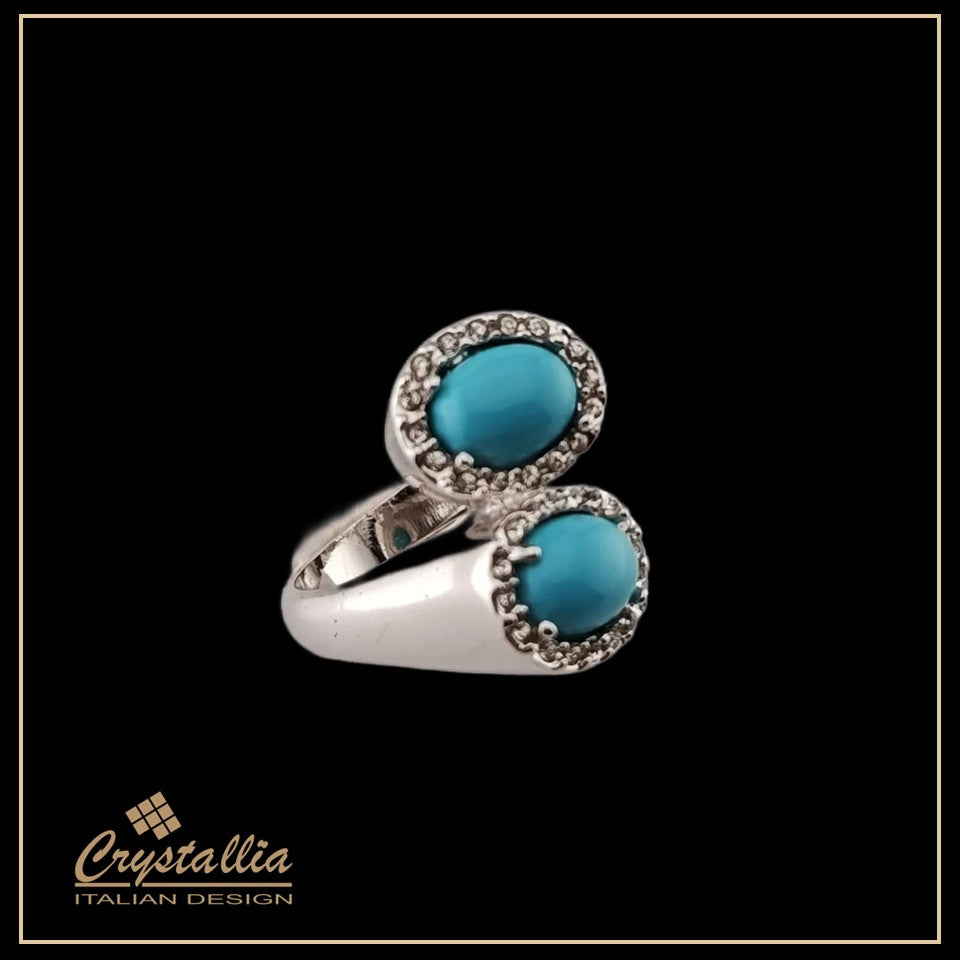 Silver ring with two turquoise stones on a light gray background, featuring the Crystallia brand.