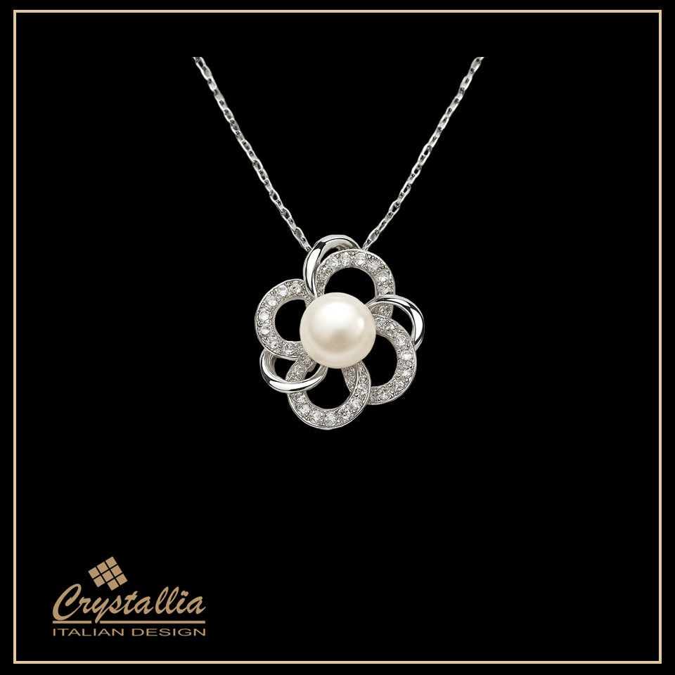 Pearl necklace with floral design on a white background, featuring the Crystallia brand.