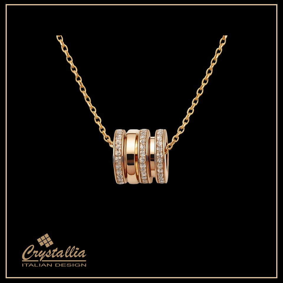 Rose gold necklace with a cylindrical pendant on a white background, featuring the Crystallia brand.
