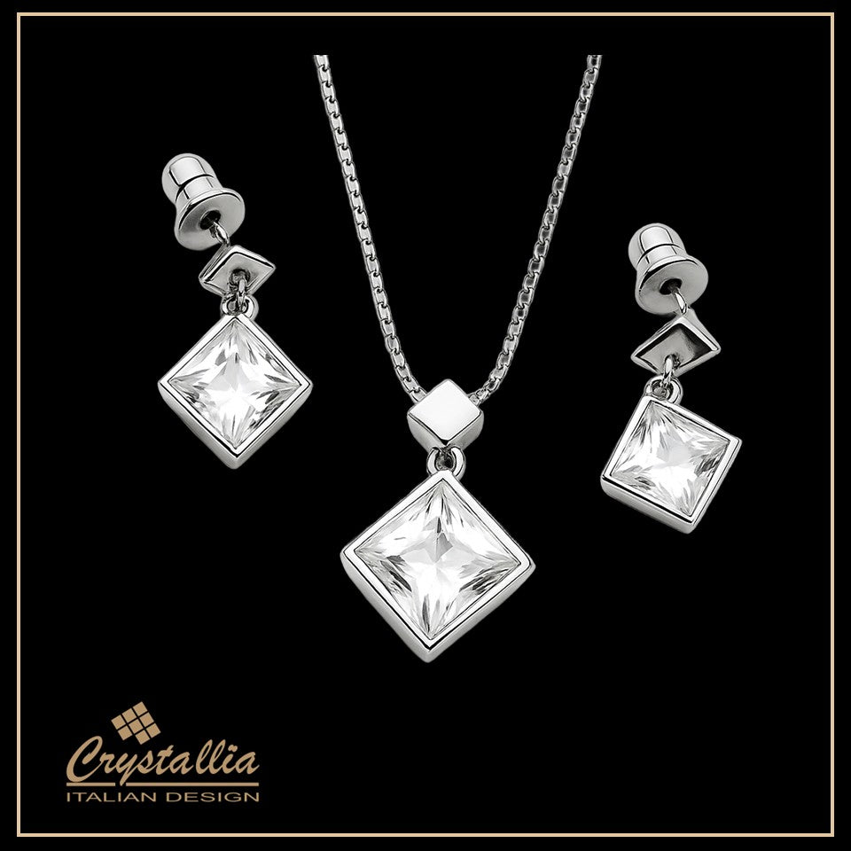 Silver necklace with square pendant and matching earrings on a light gray background, featuring the Crystallia brand.