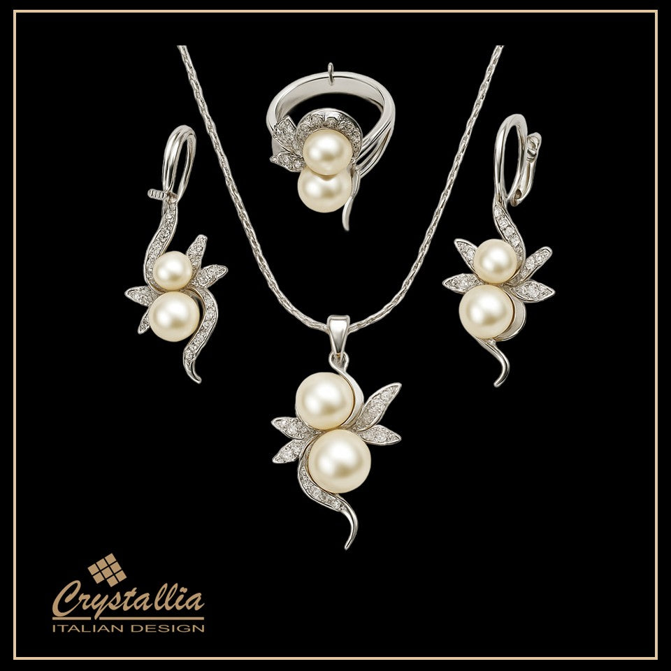 Pearl jewelry set with necklace, earrings, and ring on a white background, featuring the Crystallia brand.