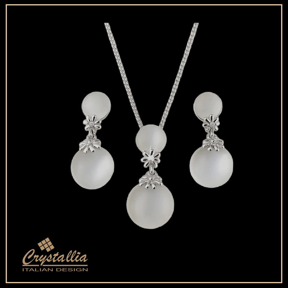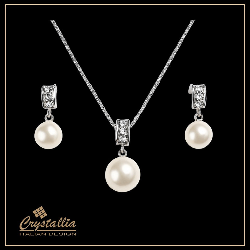 Pearl necklace and earrings set with Crystallia branding on a light gray background