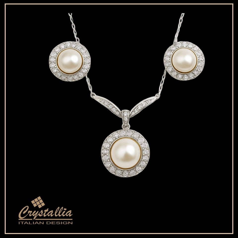 Pearl jewelry set with necklace and earrings on a light gray background, featuring the brand 'Crystallia'.