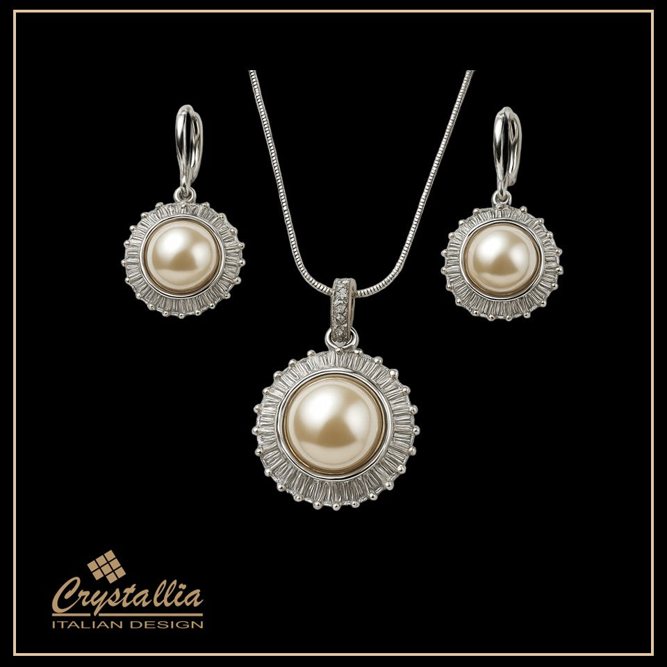 Pearl jewelry set with the Crystallia brand on a white background