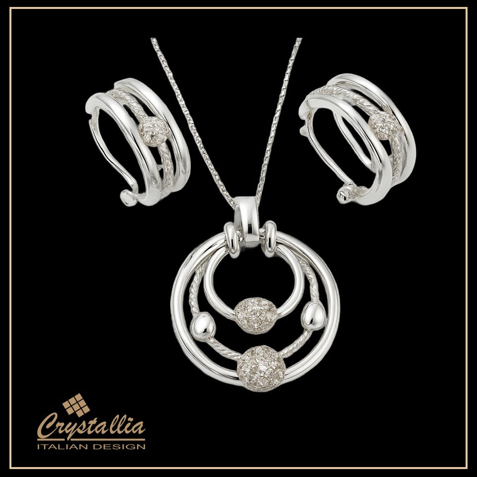 Gold jewelry set with necklace and earrings on a light gray background, featuring the Crystallia brand. Silver jewelry set with pendant, earrings, and brooch on a white background, featuring the Crystallia brand.