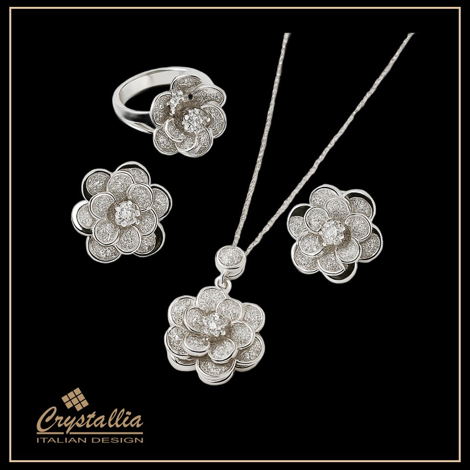 Jewelry set with floral designs including a necklace, ring, and earrings on a white background with 'Crystallia' branding.