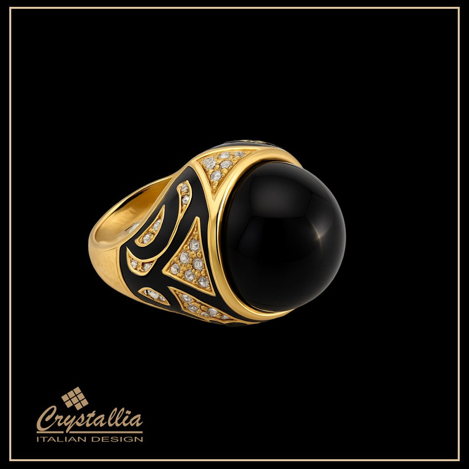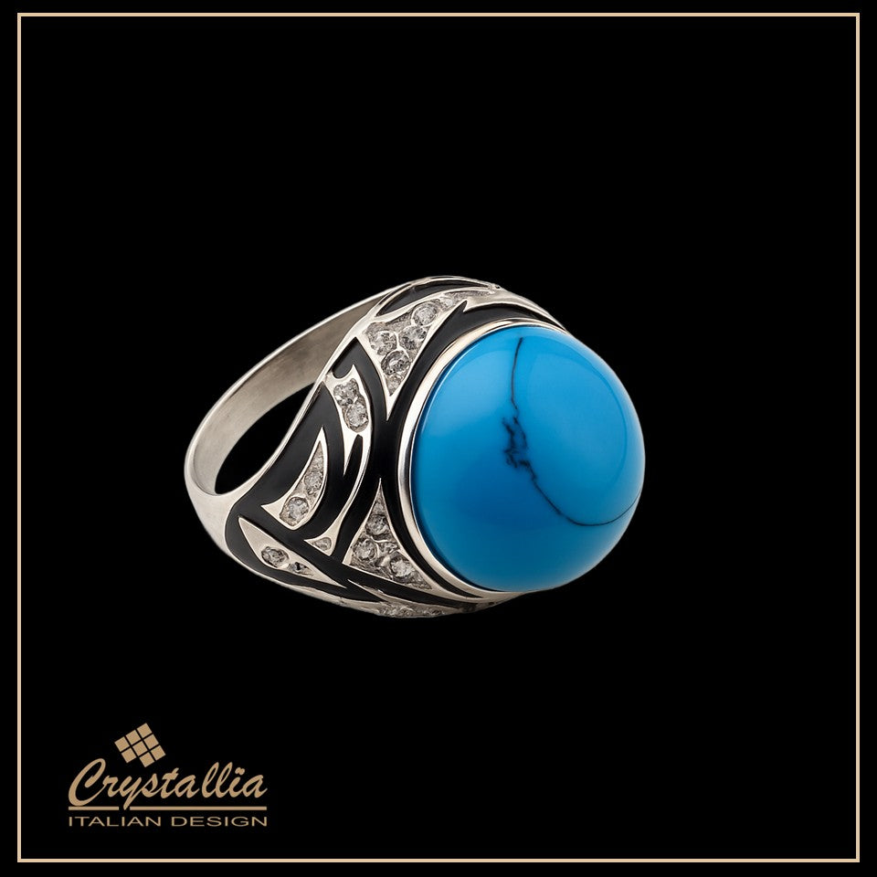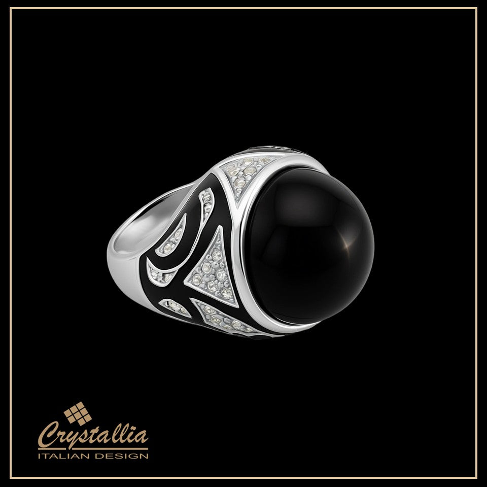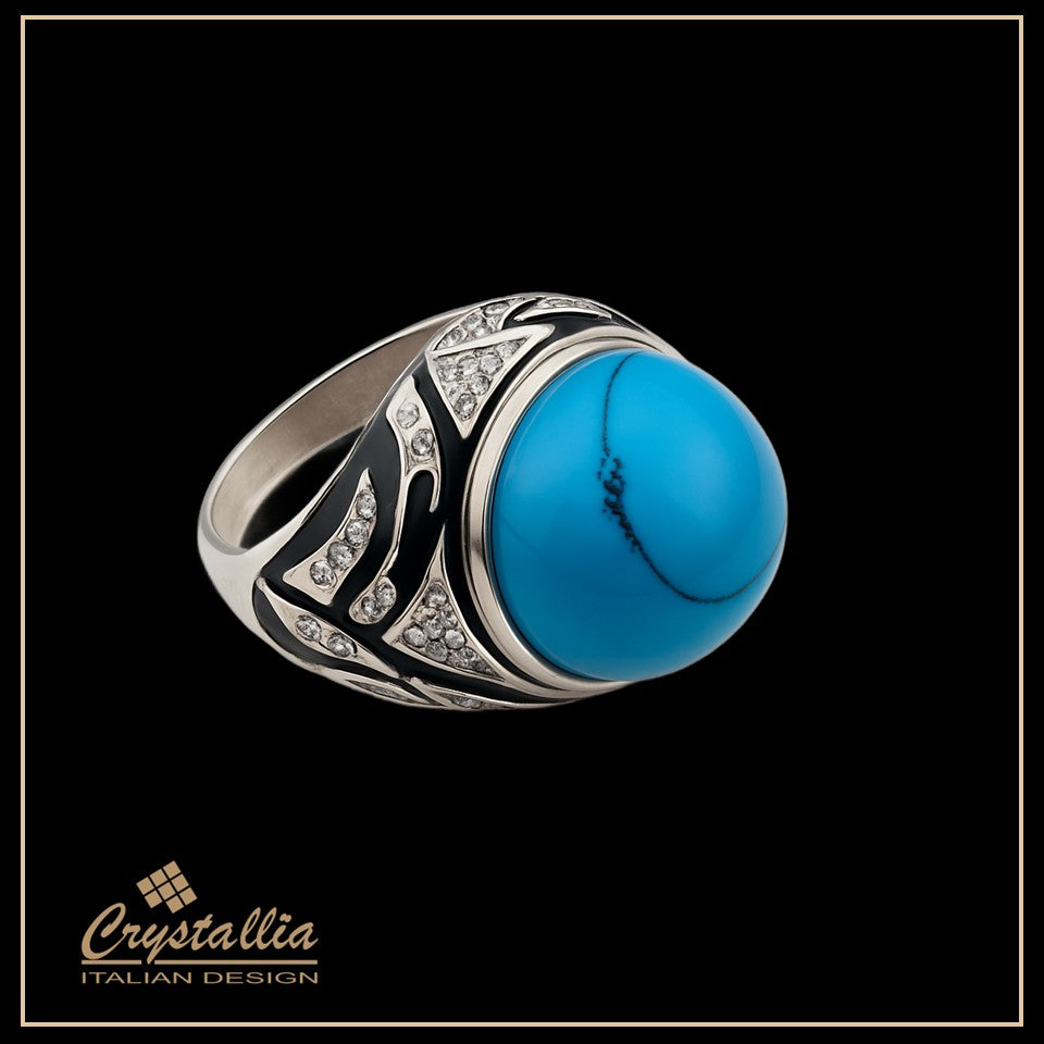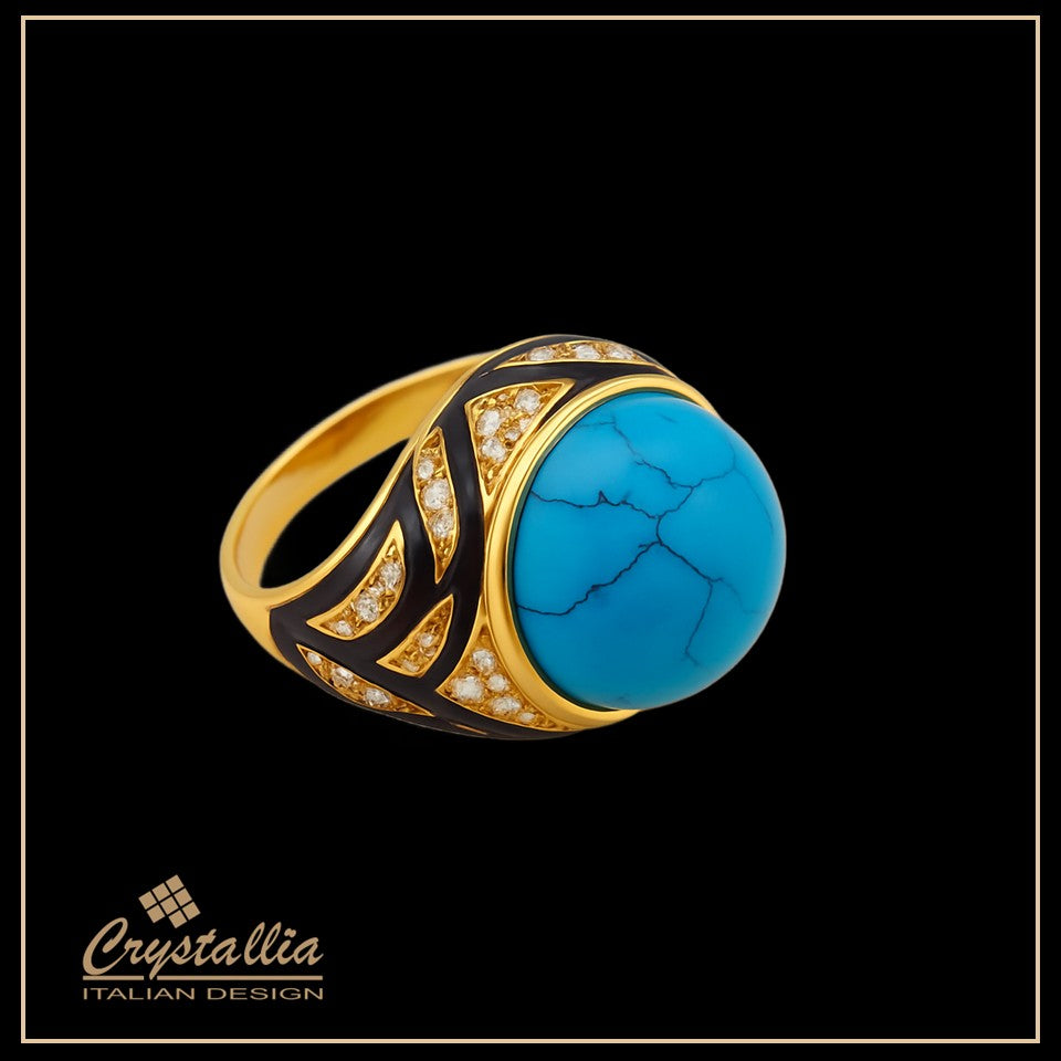 Silver ring with a black gemstone on a gray background, featuring the Crystallia brand. Gold and black ring with Crystallia branding on a light gray background. Silver ring with a blue stone on a light gray background, featuring the Crystallia brand. Gold ring with turquoise stone and Crystallia branding on a light