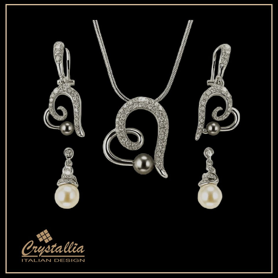 Silver jewelry set with pearls on a white background, featuring the Crystallia brand.