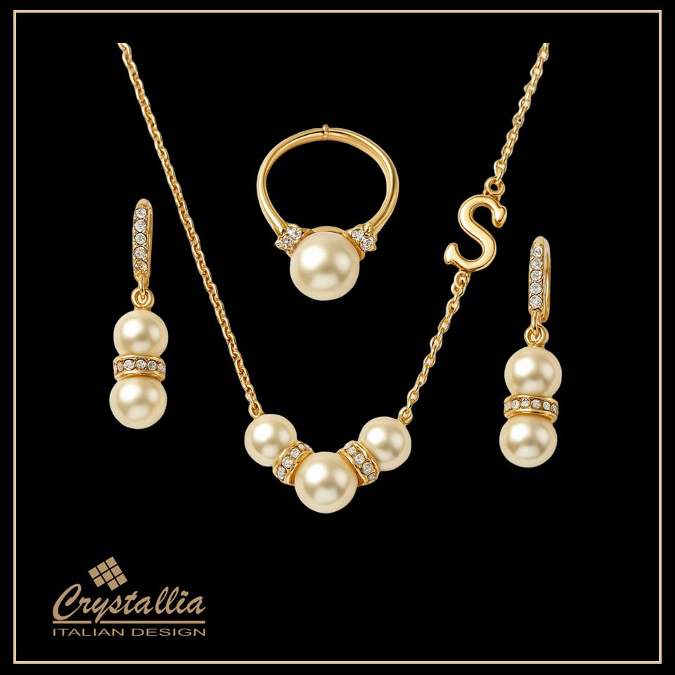 Gold jewelry set with pearls and Crystallia logo on a light background